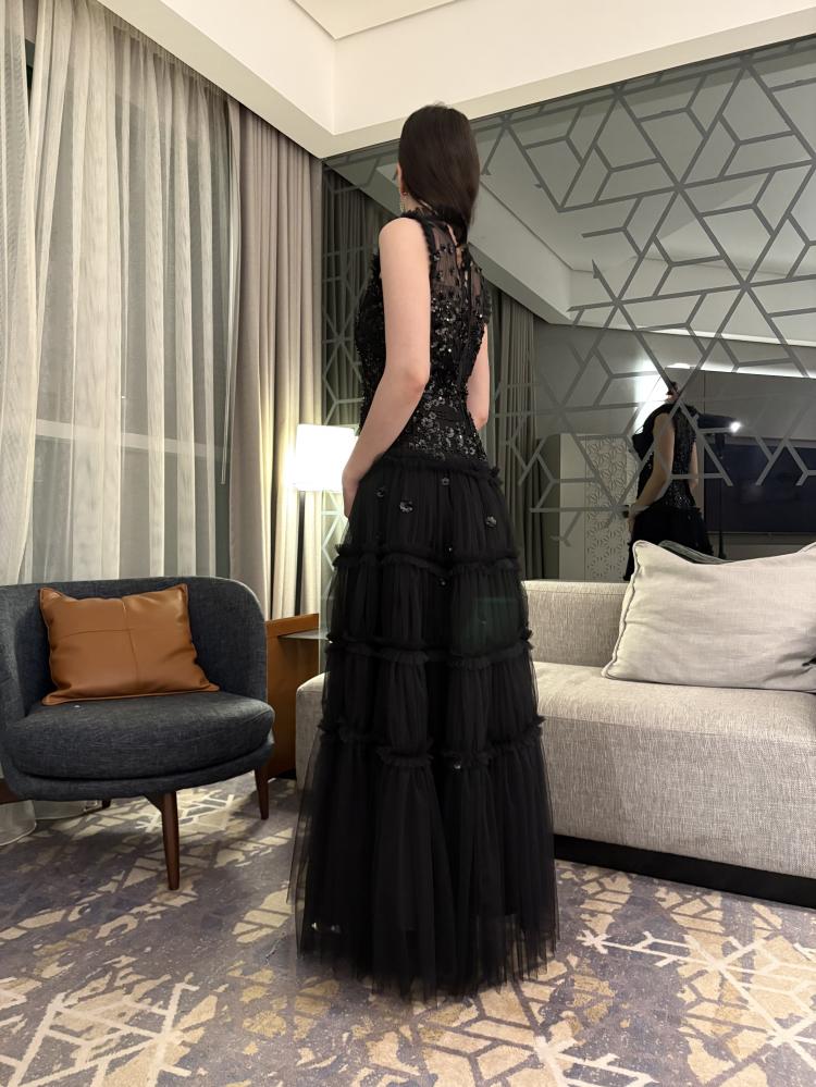 فستان سهرة أسود راقٍ بتطريز فاخر وتول ناعم