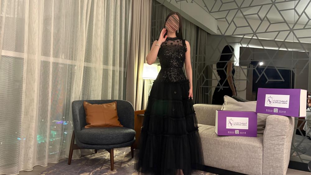 - الخامة: تول ناعم متعدد الطبقات مزين بتطريز يدوي فاخر ولمسات من الخرز اللامع