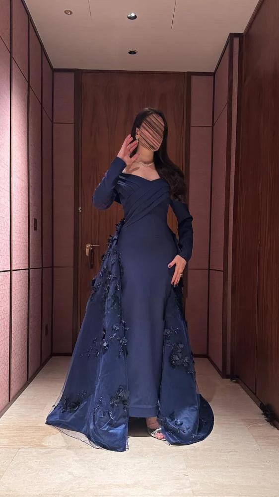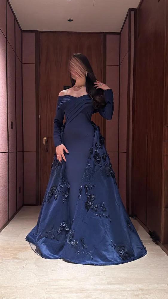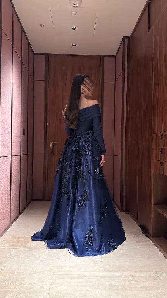 فستان السهرة "الأزرق الكحلي الأثيري" بأكمام طويلة وتنورة علوية مطرزة بالورود ثلاثية الأبعاد.