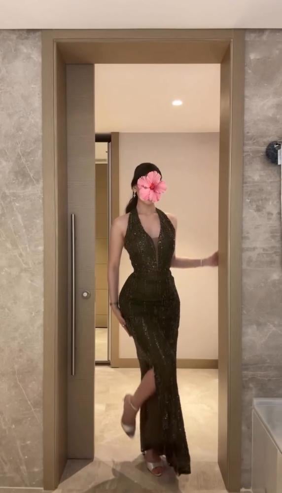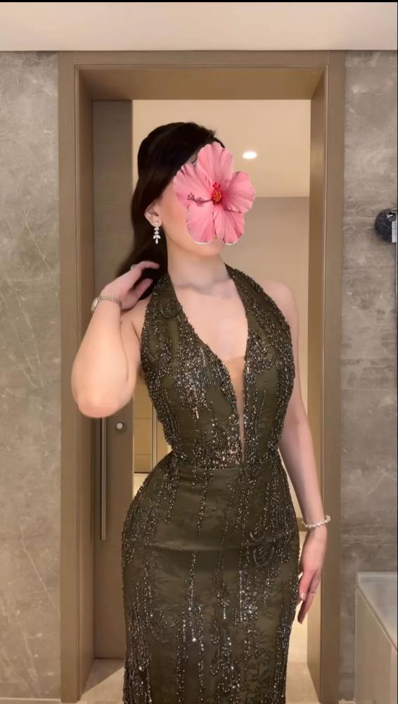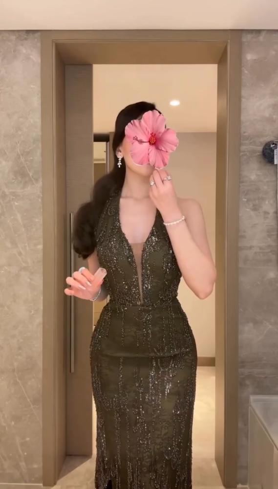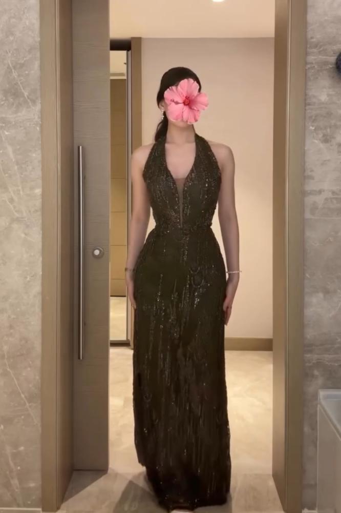 1. اللون والقماش: يبدو الفستان بلون داكن، ربما أسود أو أخضر غامق (زمردي) أو بني داكن. القماش مُغطى بالكامل أو بشكل مكثف بالترتر اللامع (Sequins)، مما يمنحه بريقًا وتألقًا فاخرًا تحت الضوء.