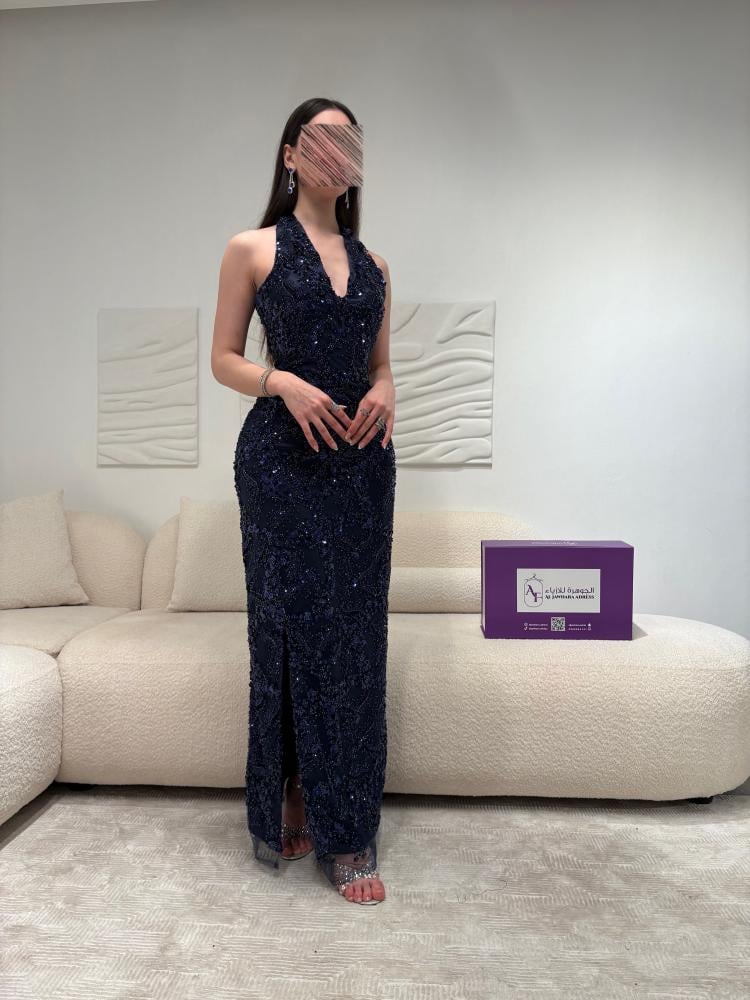 هذا فستان سهرة رسمي وطويل يتميز بلونه الكحلي الداكن أو الأزرق البحري العميق. يغطي الفستان بالكامل تطريز كثيف ثلاثي الأبعاد من الخرز والترتر اللامع، مما يضفي عليه بريقًا باهرًا وملمسًا فاخرًا.