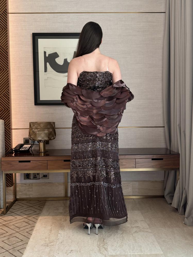 تألقي بإطلالة دافئة وفاخرة مع هذا الفستان الساحر. يجمع التصميم بين القصة الكلاسيكية والتفاصيل البراقة، وهو مثالي للمناسبات المسائية الفخمة والحفلات المميزة.
