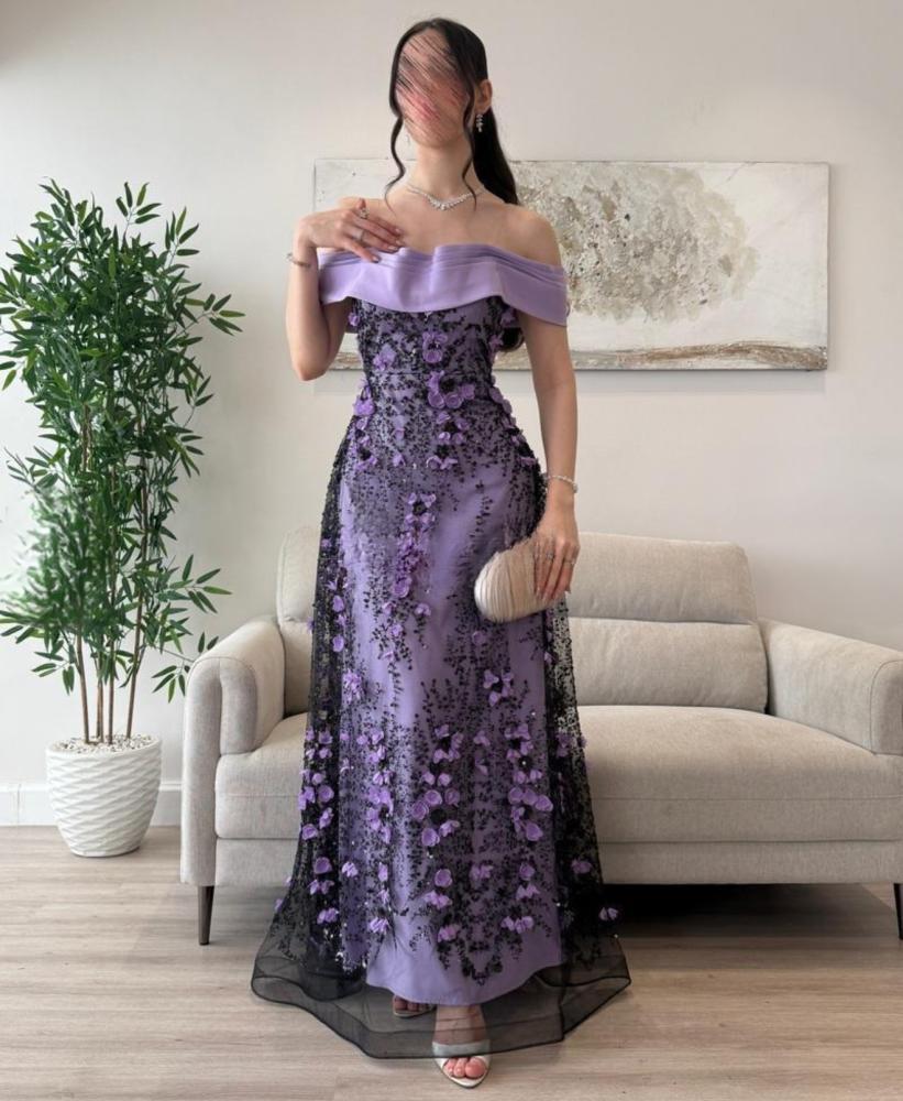 تألقي بإطلالة فريدة مع هذا الفستان البنفسجي المطرز بتفاصيل زهرية بارزة تضيف لمسة من الرقي والجاذبية. يأتي بتصميم أوف شولدر عصري يبرز جمال الكتفين، مع قماش شفاف مطرز بالأسود يمنحك مظهراً راقياً ولافتاً في المناسبات الخاصة والسهرات.