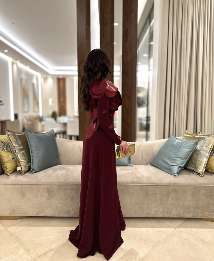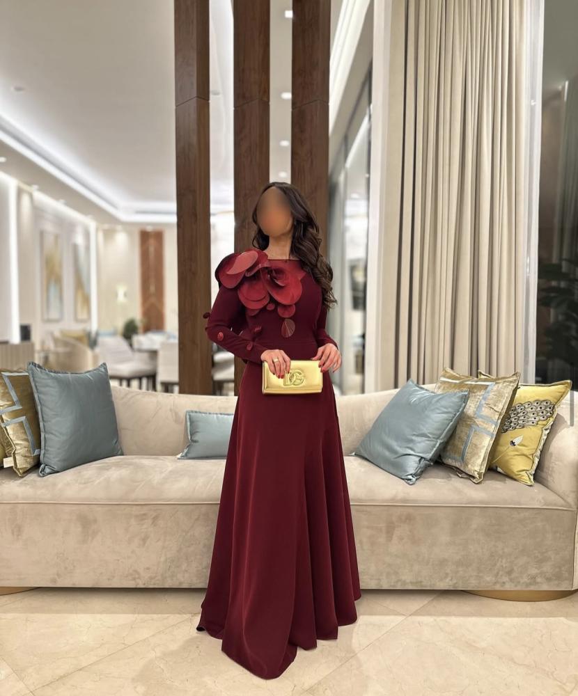 اللون: فستان سهرة طويل بلون "عنابي" عميق أو "خمري" (Bordeaux/Maroon).