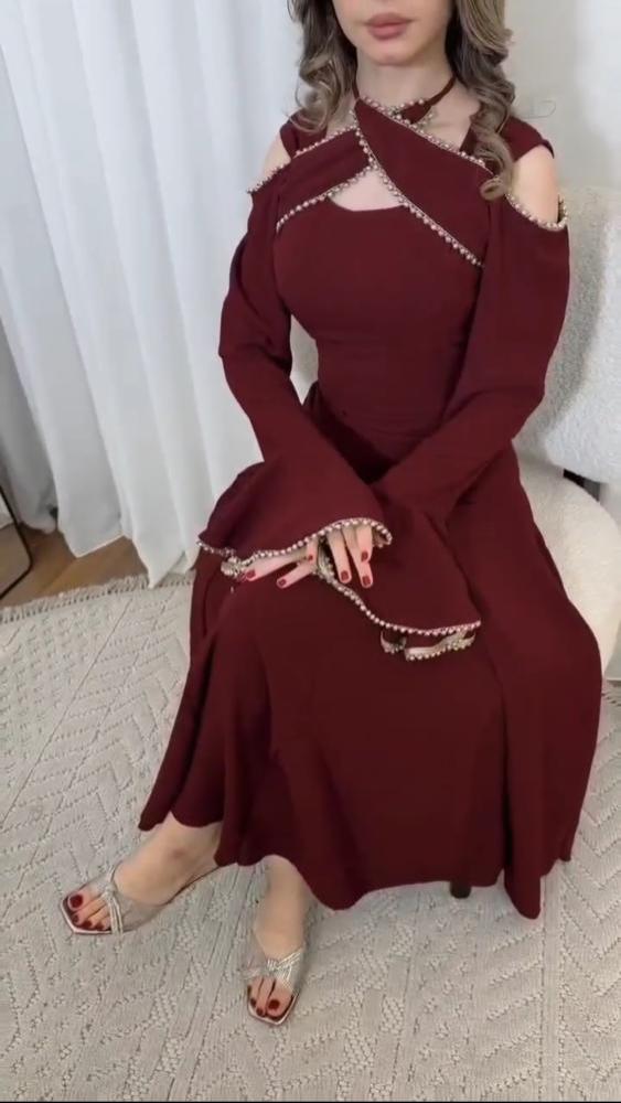 فستان سهرة أنيق باللون الأحمر، مصمم ليمنحك إطلالة راقية وجذابة في المناسبات الخاصة.