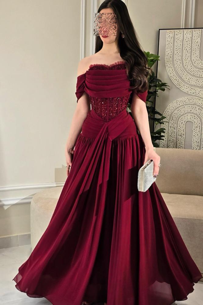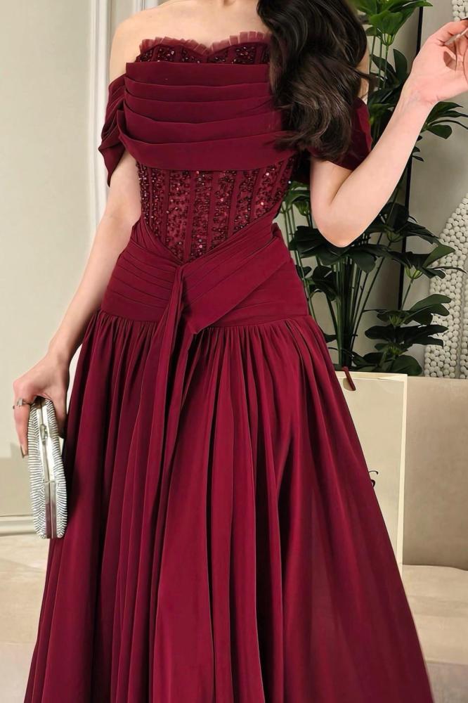فستان سهرة طويل بلون خمري بقصة مكشوفة