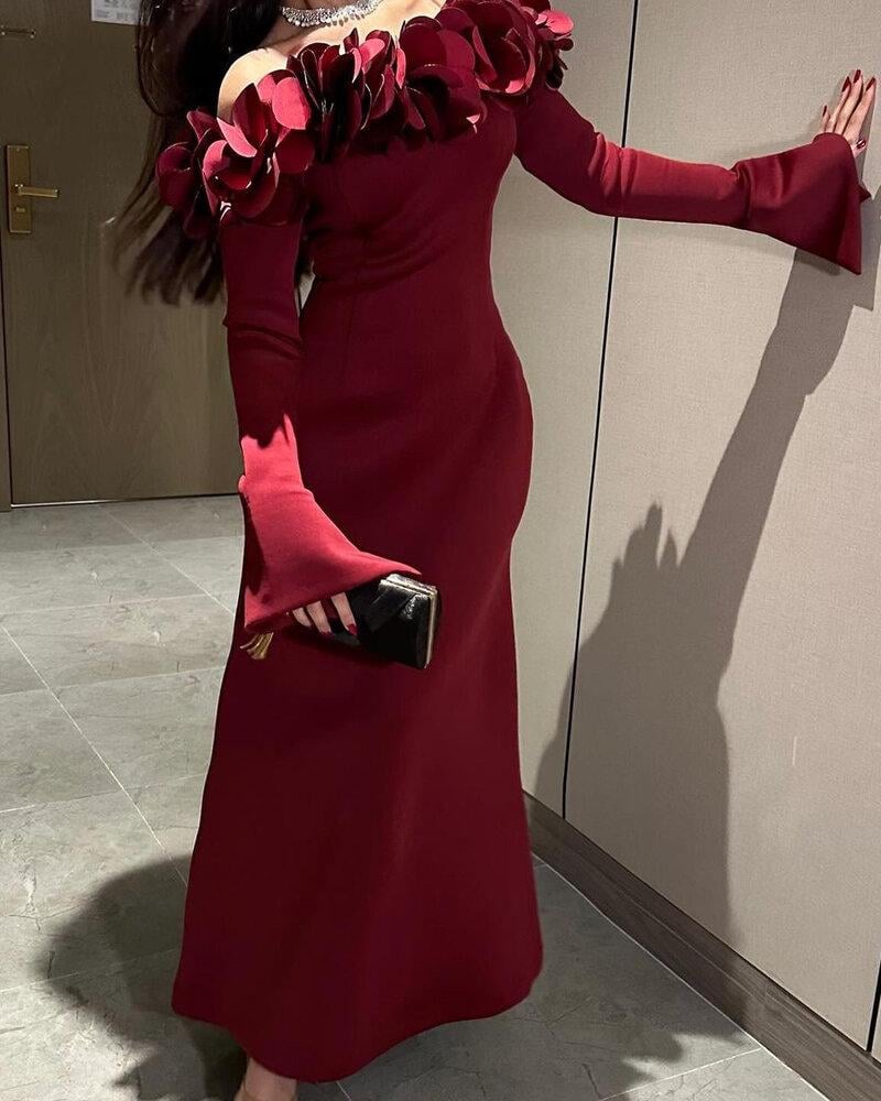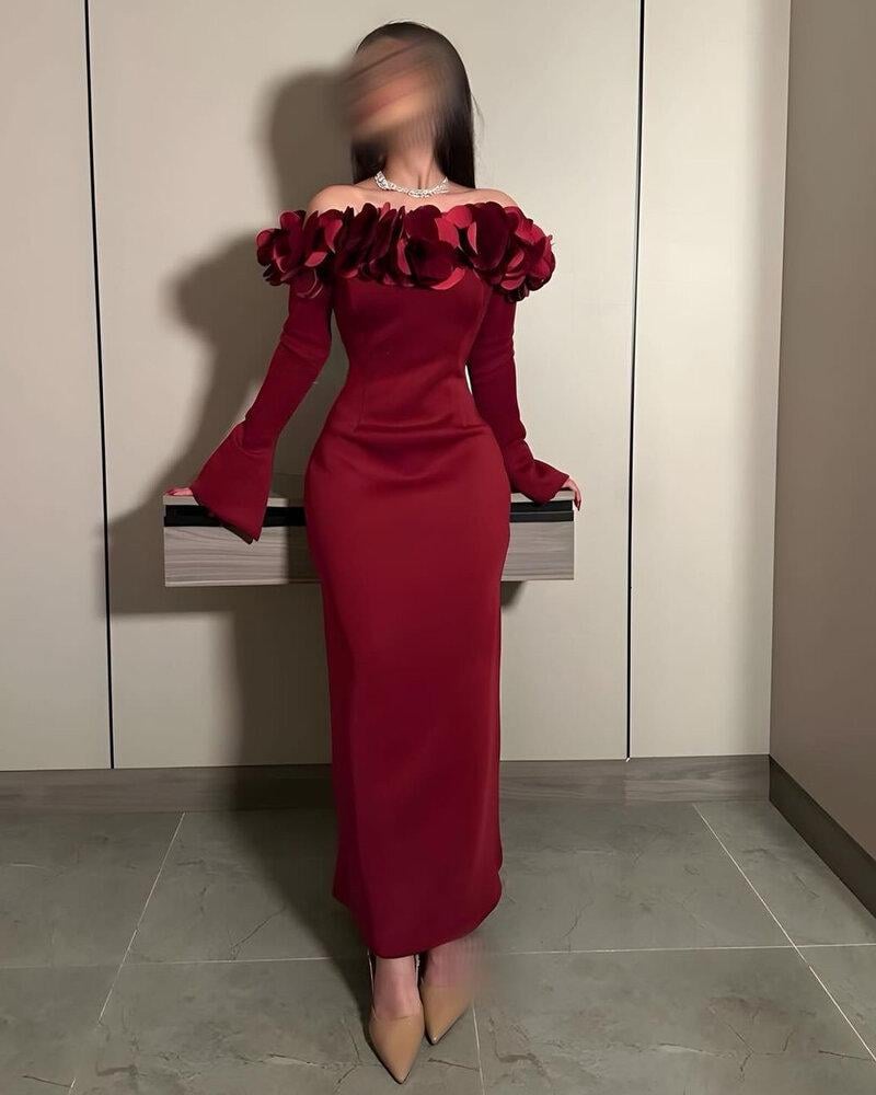 تم تصميم الفستان من خامات عالية الجودة، مما يجعله خفيفًا وناعمًا على البشرة. يتميز بقصة ضيقة تبرز منحنيات الجسم، مع أكمام طويلة مزينة بتفاصيل رائعة من الأقمشة المتمايلة، مما يضيف لمسة عصرية وفريدة. كما أن الفستان يمتاز بتفاصيل الزهور الرقيقة على منطقة الصدر، مما يجعله فستانًا مميزًا يلفت الأنظار.