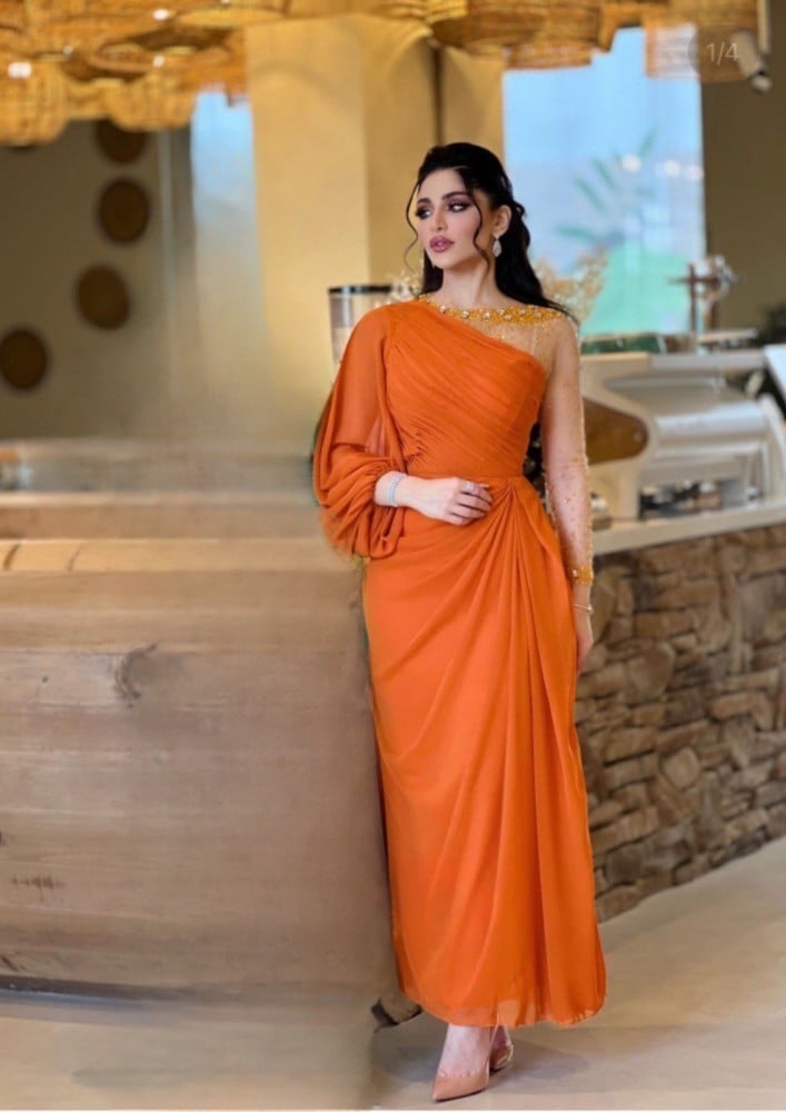 فستان شيفون بطبقات مميز مع كم مزين بالكريستال