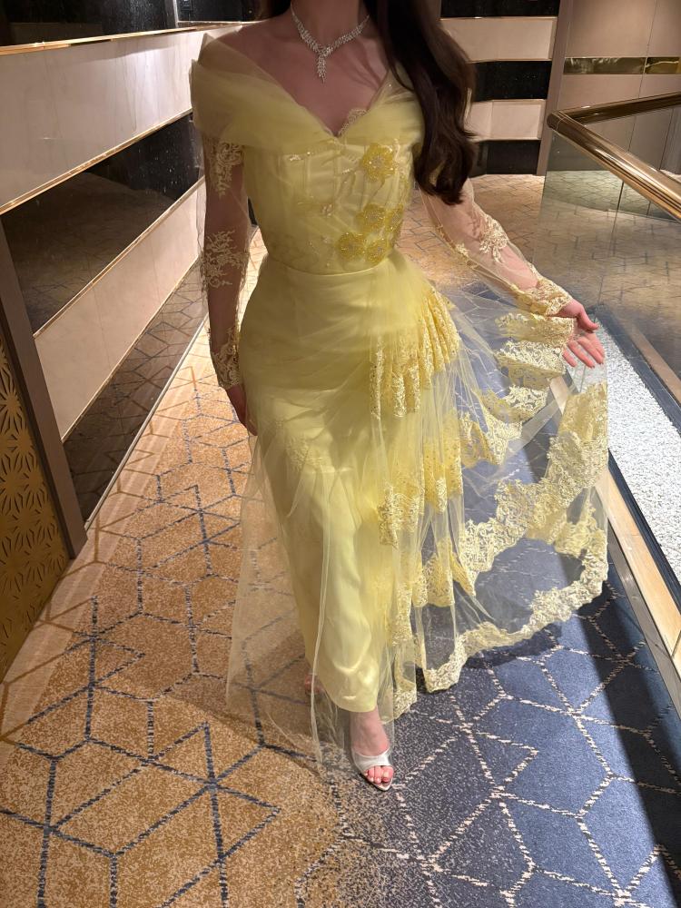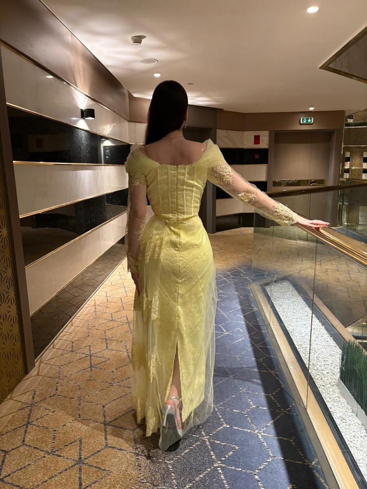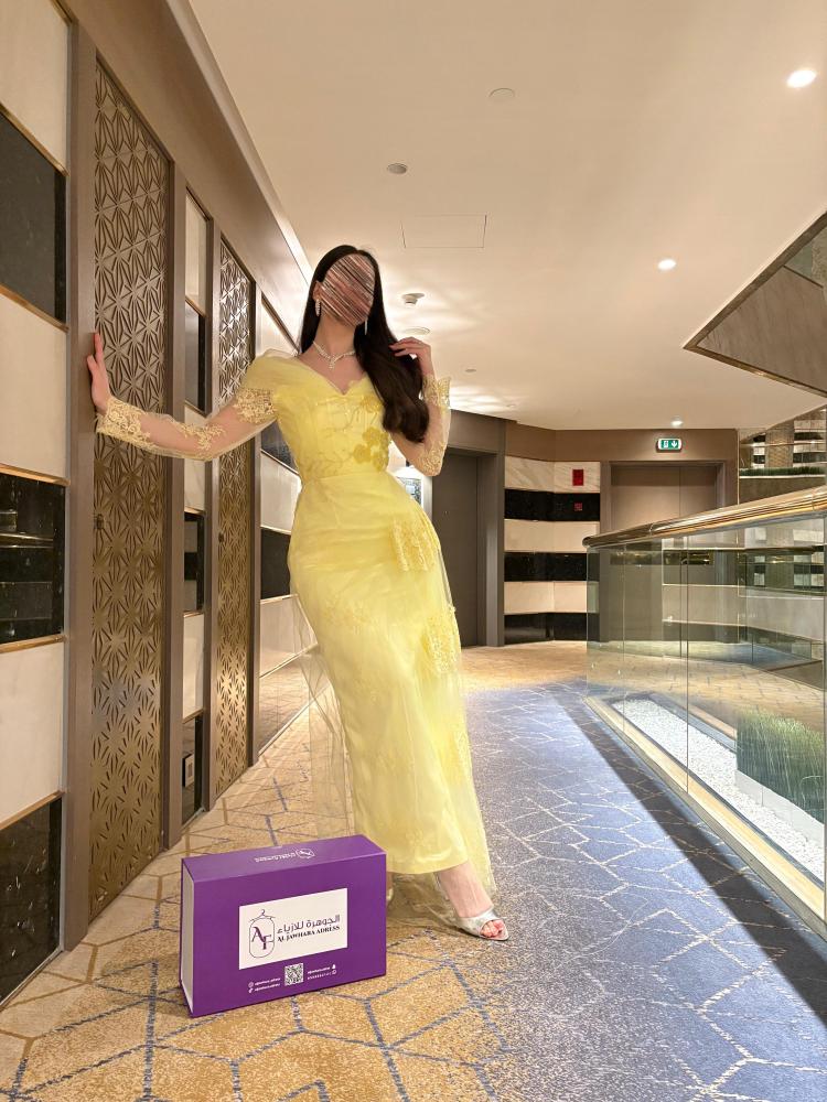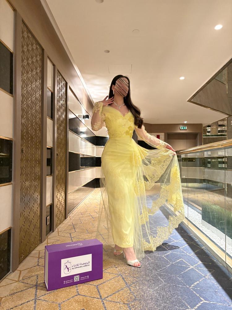 الفستان يأتي بياقة ناعمة وأكمام شفافة مزينة بتطريز أنيق يضفي لمسة رومانسية، بينما يمتد القماش الشفاف المزين بالدانتيل على الجانبين ليمنحك حضورًا ساحرًا مع كل خطوة. اللون الأصفر المشرق يرمز إلى البهجة والثقة، ليجعلك محط أنظار الجميع في الحفلات، الخطوبات أو المناسبات الخاصة.