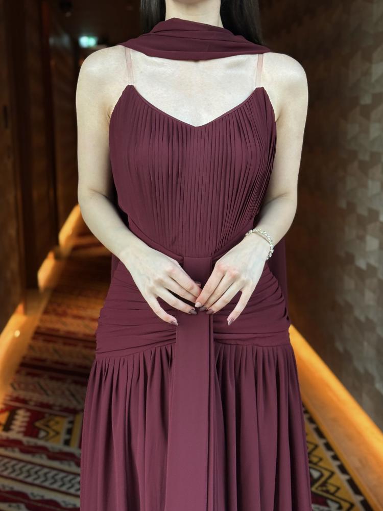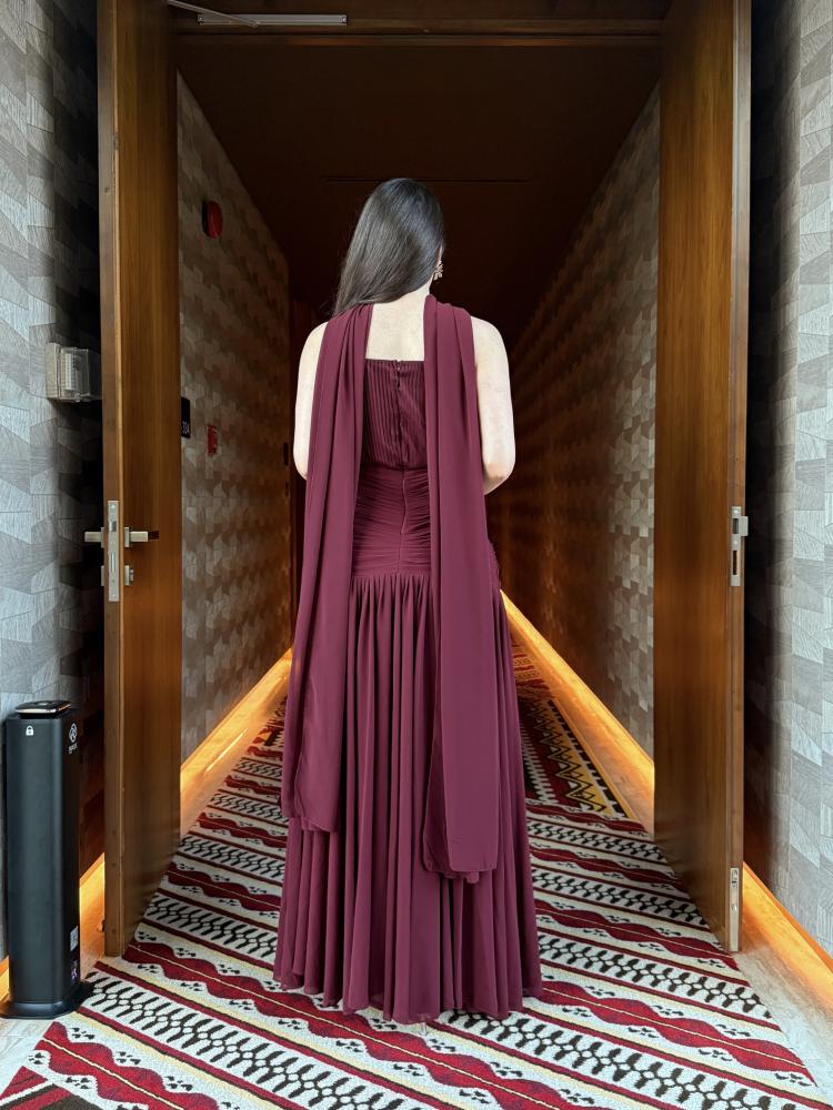 • اللون والنسيج: فستان بلون عنابي غامق (Burgundy) أو أحمر خمري، مصنوع من قماش الشيفون أو الكريب الناعم، مما يمنحه انسيابية وحركة مريحة.