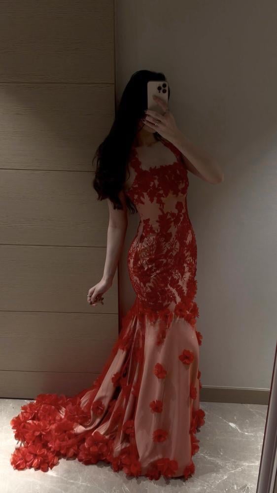 3. الزهور ثلاثية الأبعاد (3D Flowers): الميزة الأبرز هي الزخارف الزهرية البارزة ثلاثية الأبعاد باللون الأحمر، والتي تتوزع بكثافة خاصة حول منطقة الوركين وأسفل الفستان وعلى طول الذيل.